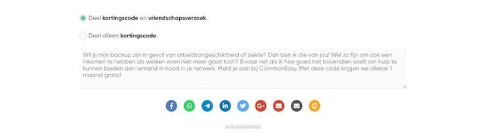 Je kunt de kortingscode simpelweg kopiëren en naar bevriende ondernemers sturen en ze het vervolgens lekker uit laten zoeken óf – en daar zou onze voorkeur naar uitgaan – je gebruikt een van de negen geïmplementeerde manieren om de kortingscode te delen.