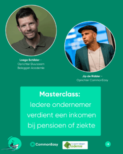 Jip de Ridder van CommonEasy en Loege Schilder van Duurzaam Beleggen Academie, ieder expert op hun vakgebied, hebben de handen ineen geslagen en organiseren op maandag 19 januari 2026, een gezamenlijke masterclass. Tijdens dit webinar nemen zij je mee in dé oplossing voor risico bij ziekte en hoe duurzaam beleggen kan ondersteunen bij opbouwen van jouw pensioen.